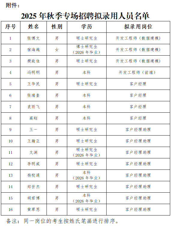 根据公司2025年11月4日发布的《2025年秋季专场招聘公告》,经过报名、资格审查、综合测评等工作程序,初步确定拟录用人选16人,现将人员名单予以公示,具体名单详见附件。